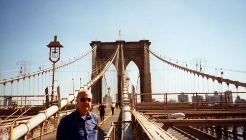 My dad on the bridge, with flag flying high above.