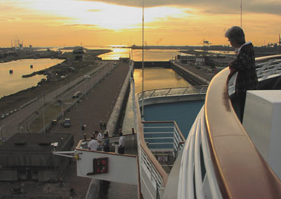 Entering the big lock at IJmuiden. The captain (back to the camera) is on the port (left) bridge wing using