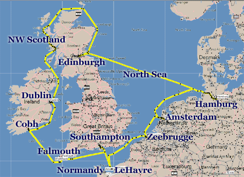 visited were Southampton, Falmouth, Cobh, Dublin, Edinburgh, Hamburg, Amsterdam, Zeebrugge, and LeHavre. Three days were