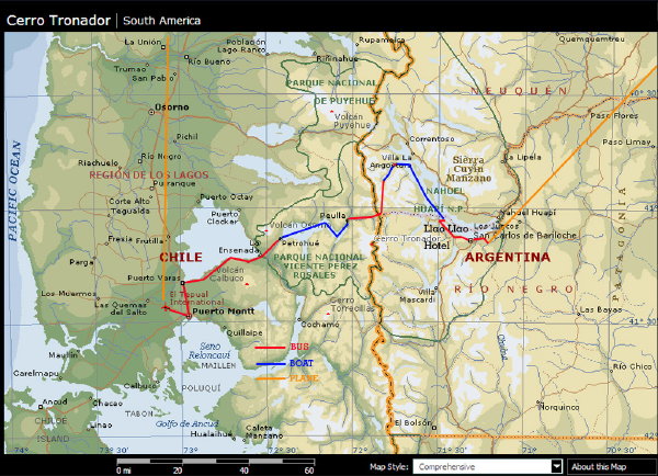 013 Andes Lake Crossing Tour Map from the Puerto Montt Airport to Bariloche by bus and boat, with a night at Puerto Varas and two nights at the Llao Llao Hotel.