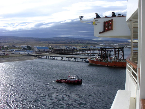 094 Leaving Punta Arenas The Captain and the Pilot are allowing the strong prevailing winds to blow the ship away from the dock without use of a tug or bow thrusters (taken from our cabin balcony).