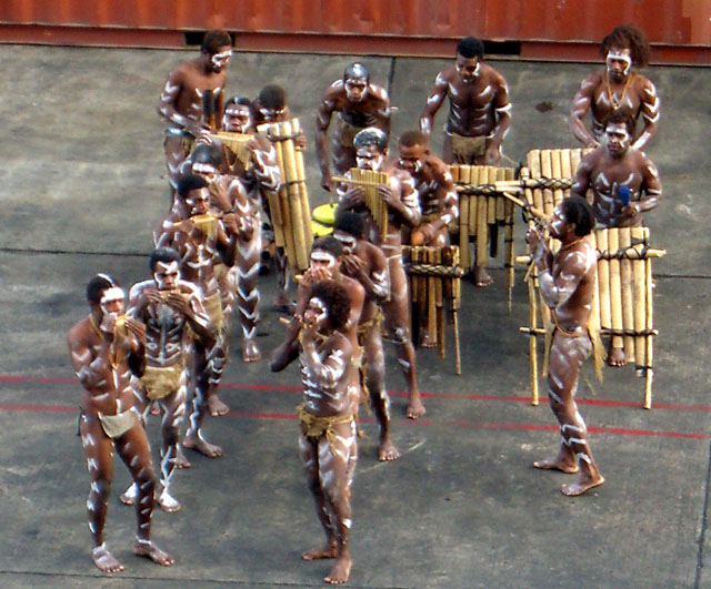 The “locals”, decked out in war paint, performed dockside. They used pan flutes of various sizes.